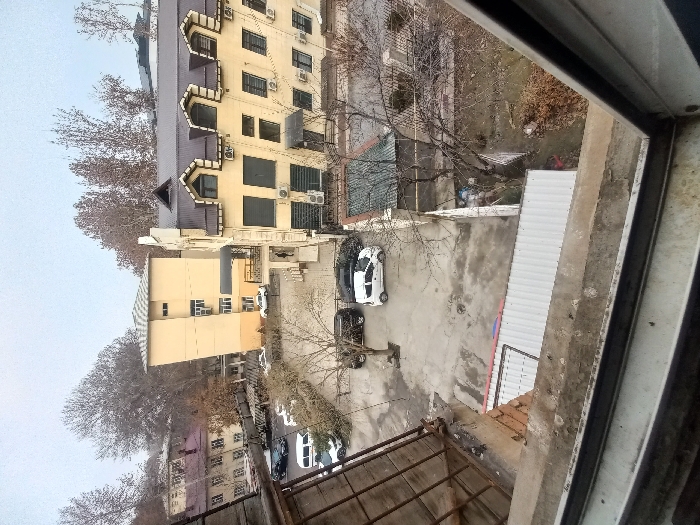 From an elevated perspective, a view unfolds, showcasing urban architecture and outdoor space. A tall building with numerous windows stands prominently. Below, a parking area is filled with several cars. Adjacent to the parking is an open courtyard or back area with sheds or structures. Bare trees are visible, suggesting it is either late fall or winter. The perspective is framed by a dirty window.
