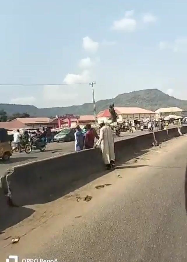street scene in what appears to be a market area. Many people are walking around, and there are numerous motorcycles and auto rickshaws parked or moving along the road. There are also buildings in the background, and a hill can be seen in the distance. The sky is blue with some clouds. The video is filmed from the perspective of someone riding a motorcycle. There is a concrete divider between the lanes of the road. The camera is shaky.