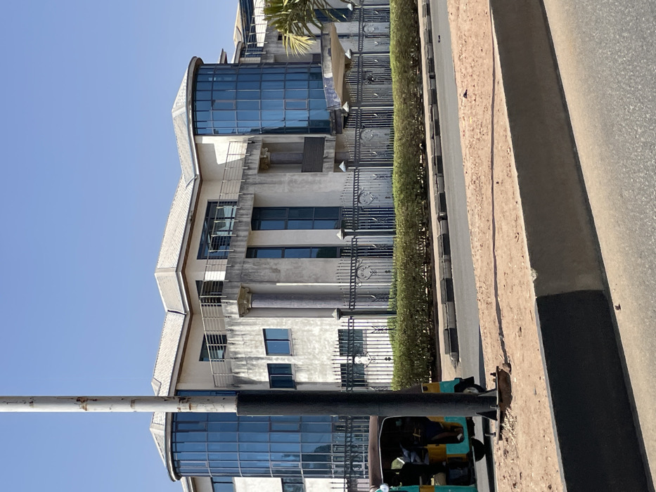 The image displays a large, multi-story building in Jos, Nigeria, under a clear blue sky