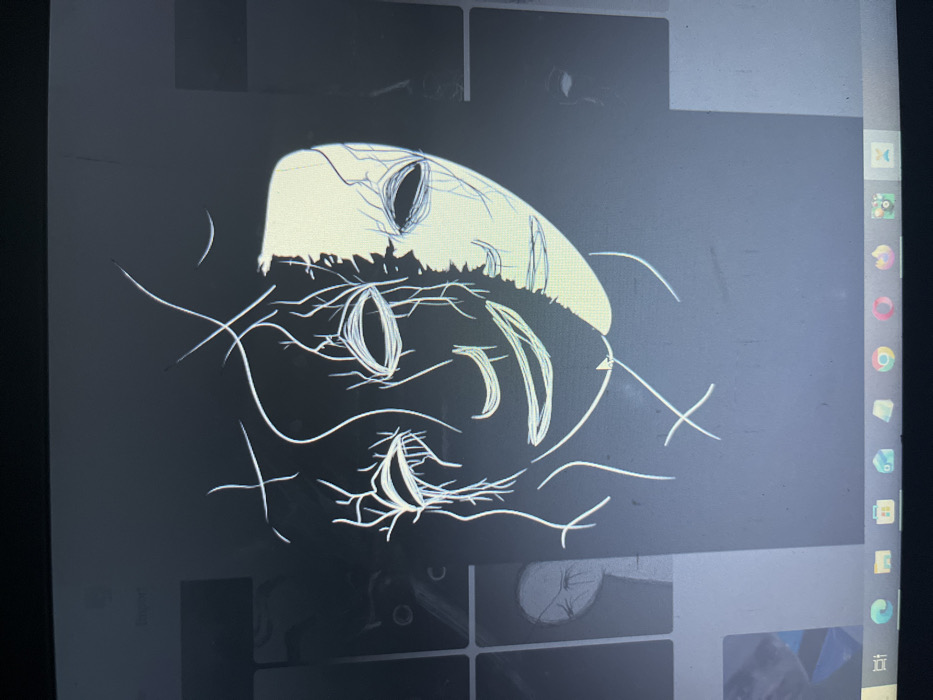 An eerie digital sketch dominates the screen, displaying a pale, rounded form with dark, empty eye sockets. Below, two more almond-shaped forms with similar hollow interiors are surrounded by thin, chaotic lines resembling roots or veins. Several stray, curved lines and "X" shapes are scattered around the composition against a dark background. The digital artwork is displayed on a monitor surrounded by multiple minimized windows.