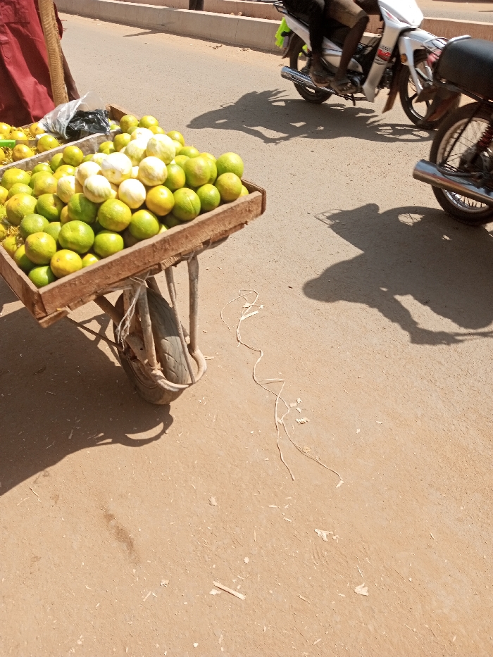 The scene, located in Akwanga, Nigeria, depicts an outdoor street vendor setup and a roadway under bright sunlight. In the foreground, a rustic wooden wheelbarrow, with a worn tire and metal supports, holds a large quantity of citrus fruits, primarily green and yellowish-green, with some pale yellow or white specimens. A clear plastic bag containing dark contents rests within the fruit pile. To the upper left, a person wearing a reddish-brown garment is partially visible, positioned near the wheelbarrow. The ground beneath the wheelbarrow and extending into the midground is a light brown, dusty, unpaved surface, scattered with light-colored debris resembling wood shavings or dried plant matter. A tangled, light-colored string lies on this surface to the right of the wheelbarrow. In the midground, two motorcycles are present on a paved road. The left motorcycle is white with black accents and a visible chrome exhaust pipe; a person's lower legs, clad in dark pants and shoes, are visible mounted on it. This motorcycle and rider cast a distinct, elongated shadow. The rear wheel and chrome exhaust of a second motorcycle are partially visible on the far right. A low, light-colored concrete barrier or curb separates the immediate foreground from a background area. Strong shadows throughout the image indicate overhead sunlight.