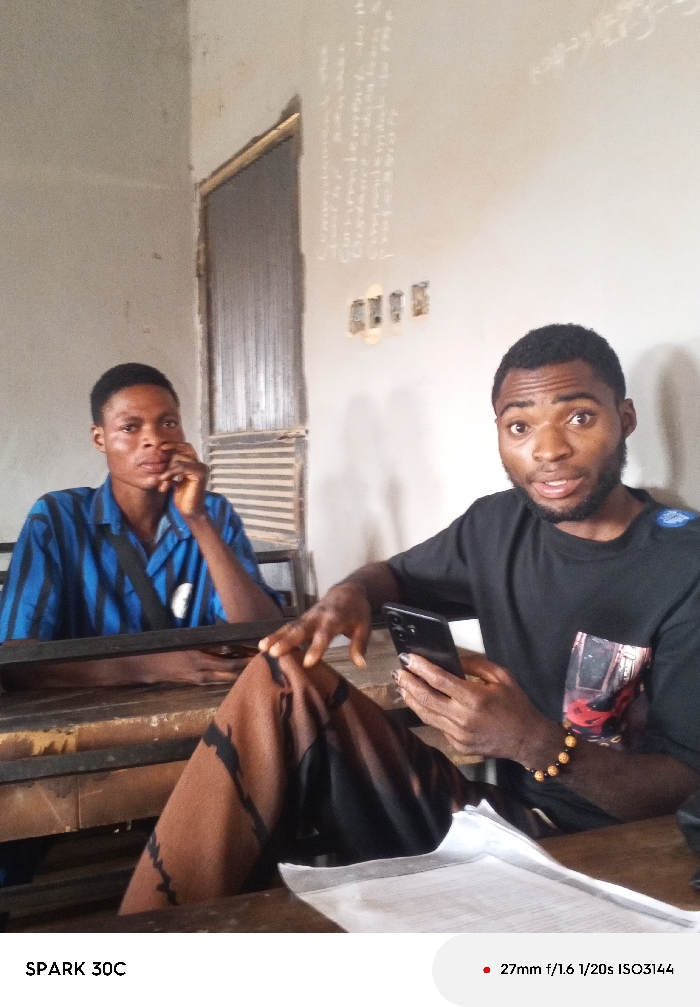 This image, captured in Akwanga, Nigeria, depicts an indoor scene featuring two male subjects seated at wooden desks