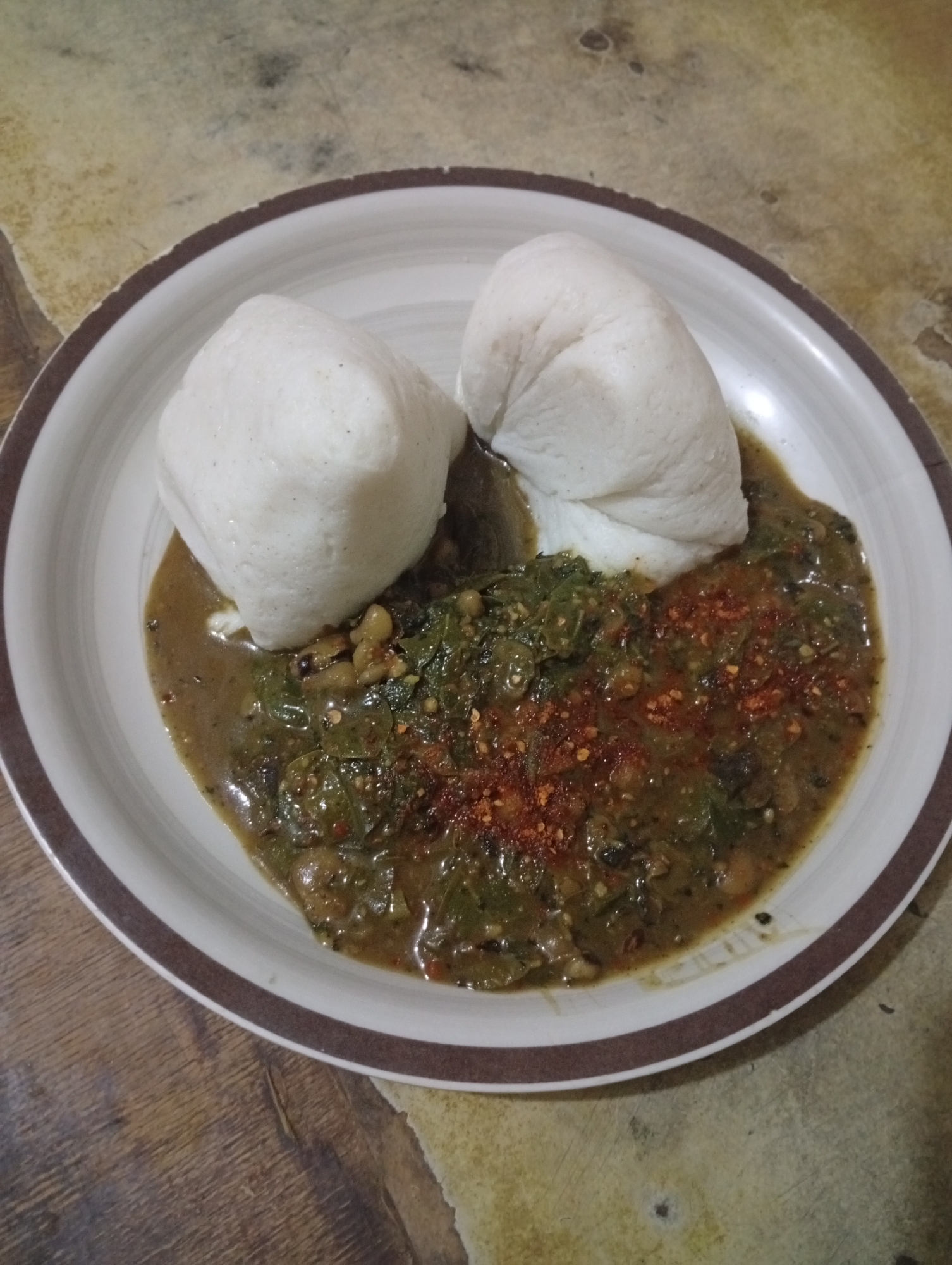 A white ceramic plate with a brown striped rim holds two irregular white mounds of a dough-like staple food submerged in a green, viscous stew. The stew contains visible leafy vegetables and light brown legumes, and is topped with a concentrated sprinkle of red chili flakes or ground pepper. The plate rests on a mottled brown and beige surface, consistent with a wooden or tiled countertop. The scene is located in Gombe, Nigeria.