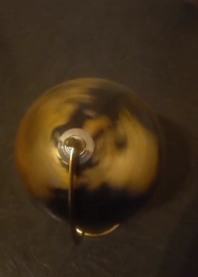 spinning globe from above. It has a gold and black color scheme. The globe spins rapidly, blurring the details of the continents. A golden stand supports the globe, and a dial with numbers sits at the top. The background is a dark, textured surface.