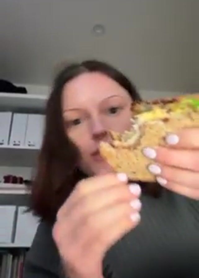 A woman with shoulder-length brown hair, wearing a dark green sweater, is eating a sandwich in a video
