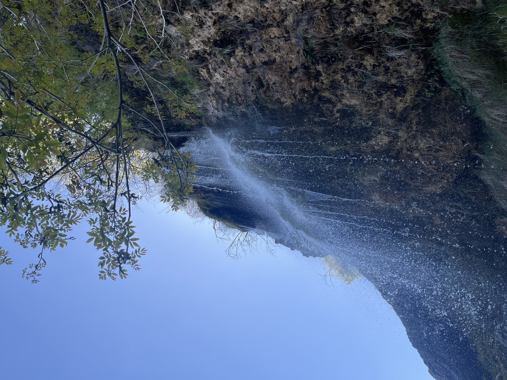 A waterfall is shown plunging down a rocky cliff face, with the camera angled upward