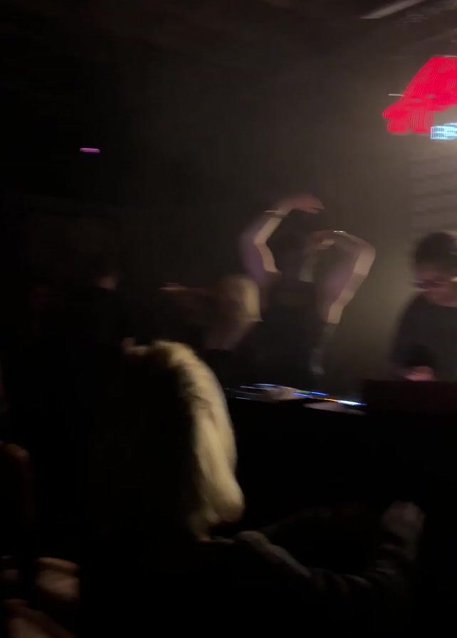 DJ performing in a dark, crowded club with a large "Airbeat One Berlin" sign illuminated behind them. Several people can be seen in front of the DJ, including one with blonde hair in the foreground. The DJ appears to be mixing music and engaging with the audience. The lighting is dim, with spotlights highlighting the DJ and the sign. Overall, the video captures the atmosphere of a lively club event.