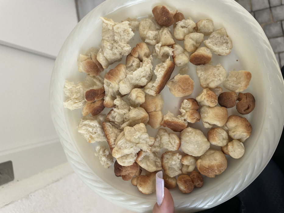 The image displays a close-up, downward-angled view of a white, fluted plastic plate filled with approximately 50-70 torn pieces of bread