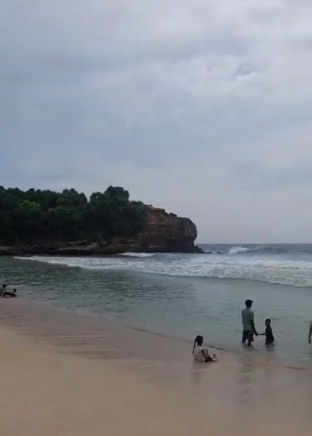 beach on a cloudy day. The sand is light-colored, and the water is clear with small waves. There are rocky cliffs covered in trees on either side of the beach. Initially, a lone woman sits in the water near the shore. Later, a group of four people, two adults and two children, are seen wading in the water. One of the adults walks deeper into the water away from the group. In the distance, a large rock formation is visible in the sea.