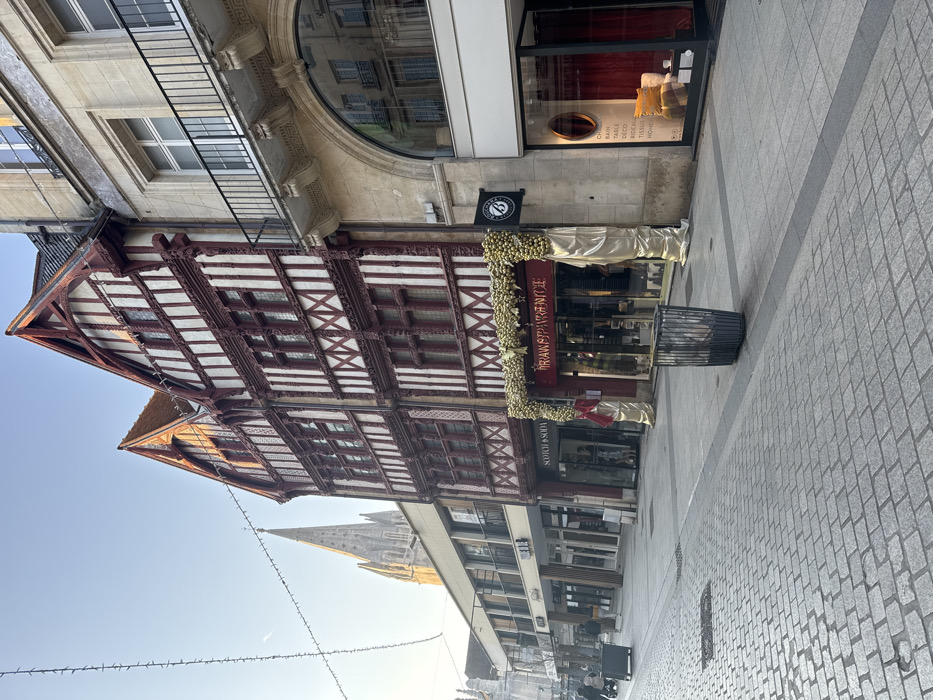 This image displays a pedestrian street scene on Rue Saint-Pierre in Caen, France, under bright daylight with direct sunlight. The foreground features a street paved with grey cobblestones, bordered by grey concrete sidewalks. On the right side of the image, a multi-story building with a light stone facade exhibits an arched ground-floor window containing a retail display with a mustard-yellow throw, a white armchair, and textual labels including "CHAMBRE," "BAIN," and "HOME." Above this, a second-story window is equipped with a black metal balcony railing. Adjacent to this structure are two prominent, contiguous historic half-timbered buildings, characterized by dark red wooden beams forming a grid pattern against white infill on multiple floors, culminating in gabled roofs. The ground floor of these half-timbered buildings houses retail establishments. The central entrance is adorned with a substantial golden-hued garland and draped with gold fabric, featuring a red bow on the left-side drape. The shop's name, "TRANSPARENCE," is visible above the entrance. To its immediate left, another shop entrance is marked with the sign "SCOTCH & SODA." A black metal slatted trash receptacle stands on the sidewalk directly in front of the "TRANSPARENCE" shop. Further down the street on the left, a series of more modern, multi-story commercial buildings with various storefronts extends into the background. Overhead, strings of small white lights are suspended across the street. In the distant background, a tall, ornate light-colored stone spire, indicative of a Gothic church, rises against a pale blue sky. Several indistinct human figures are visible walking on the left sidewalk in the mid-ground, one pushing a dark-colored wheeled container.