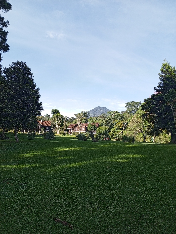 Lush green lawn dominates the foreground, dappled with sunlight filtering through trees. Two wooden buildings with dark roofs are partially obscured by foliage. A distant, verdant mountain rises against a pale blue sky with scattered clouds. Trees of varying heights and types frame the scene on either side, adding depth to the landscape.
