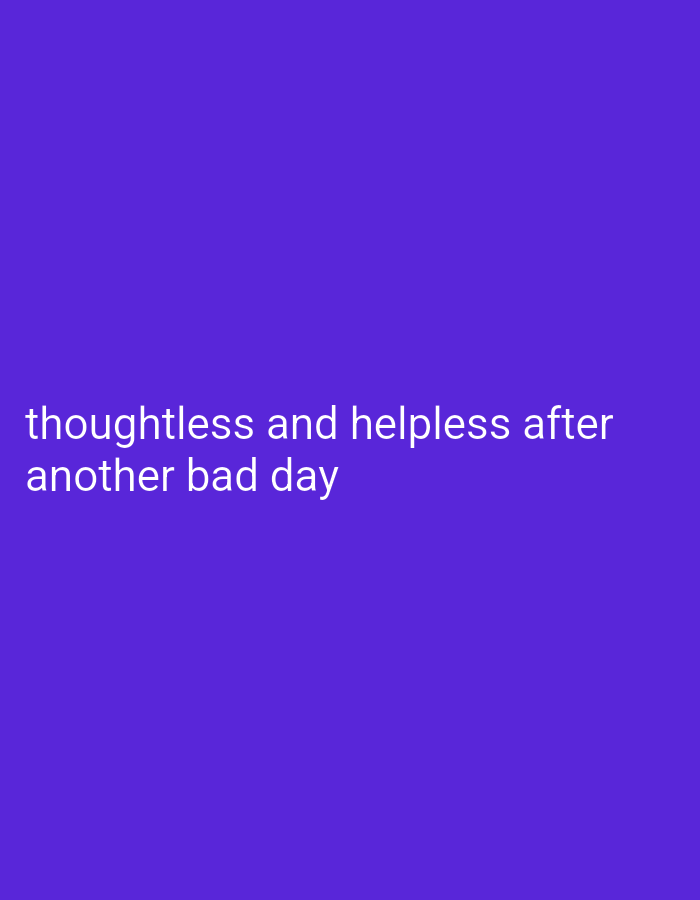 The image displays a minimalist graphic originating from Ruptsi, Bulgaria. The entire scene is dominated by a uniform purple background. White, sans-serif text is centrally aligned in the lower half of the frame, reading: "thoughtless and helpless after another bad day". There are no discernible people, specific objects, or dynamic actions or interactions present within the visual content. The environment is an abstract, two-dimensional field of solid color.