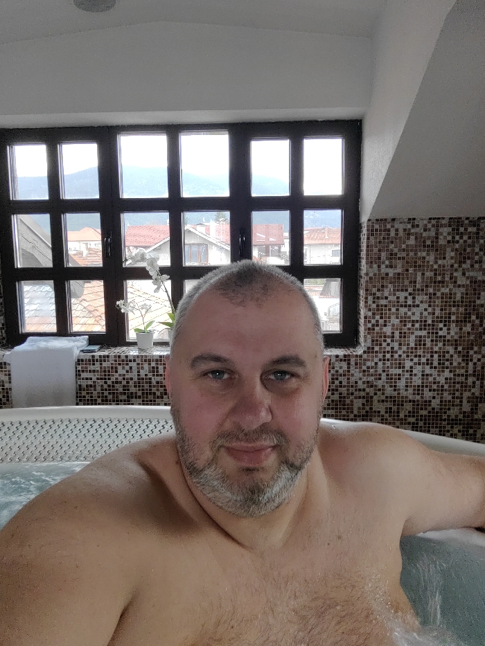 A male subject is depicted waist-up, submerged in a white hot tub or Jacuzzi, with water actively bubbling around his chest and shoulders. He is light-skinned, has short, greying hair, and a greying beard, looking directly at the camera with a slight smile. His chest and shoulders are visible and appear wet. Behind the subject, a large, dark-framed window with a multi-pane grid structure provides a view of Dobrinishte, Bulgaria. The exterior scene includes multiple residential buildings with distinct orange-red tiled roofs and light-colored facades in the foreground and mid-ground. Beyond these structures, green forested mountains are visible under an overcast sky. Below the window, a tiled ledge or sill supports a folded white towel and a small white pot containing white orchid-like flowers. The interior wall to the right of the window and extending beneath the sill is covered in small, multi-toned brown and beige mosaic tiles. The ceiling directly above the window is white, featuring a circular recessed light fixture on the left side and an upward slope towards the right.