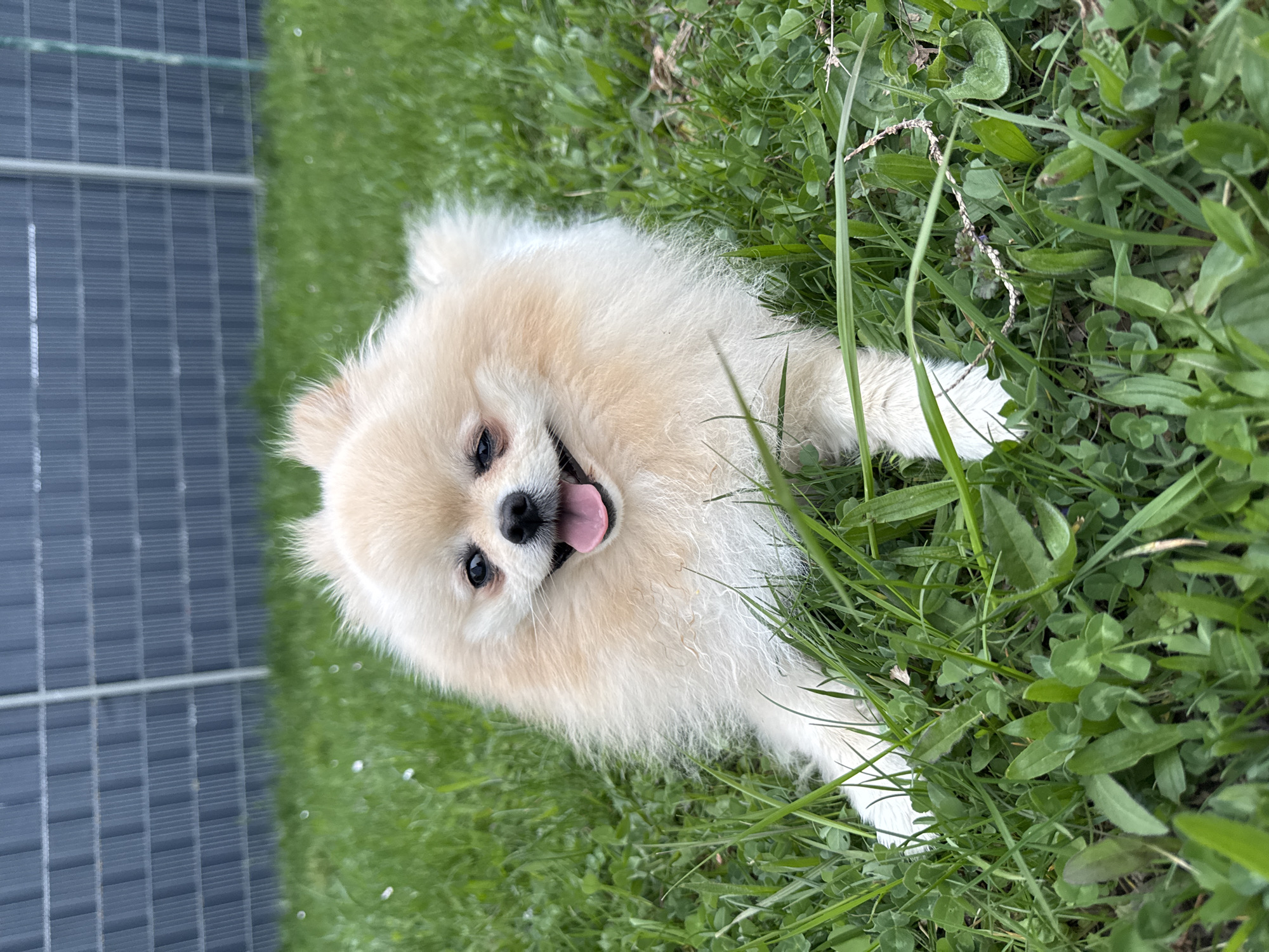 A medium-sized, light-colored Pomeranian dog lies in a grassy area with its tongue sticking out