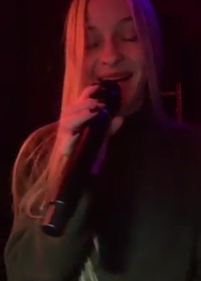 A young woman with long blonde hair is singing into a microphone. She is wearing a dark green sweater, and her nails are painted dark red. The background is dark, with some red and blue lighting.