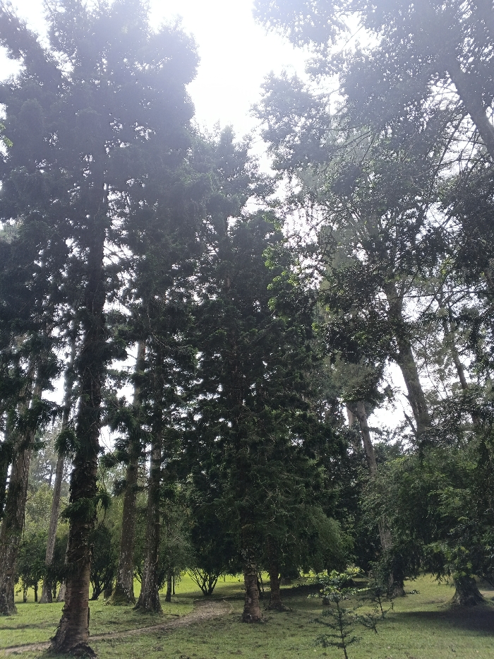 This image presents a low-angle view within a densely wooded area in Kwekwe, Zimbabwe. The scene is dominated by numerous tall evergreen trees, consistent with conifers, featuring dark green, dense foliage that extends upwards to obscure much of a bright, overcast sky. The foreground and mid-ground consist of a green grass-covered forest floor, through which a narrow dirt path winds from the lower-middle of the frame towards the background. The tree trunks are dark brown and vertically oriented, with some displaying visible texture or surface growth. Smaller trees and undergrowth are distributed deeper within the wooded expanse, contributing to a layered vegetation structure. No individuals, animals, or artificial structures are present in the observable scene.