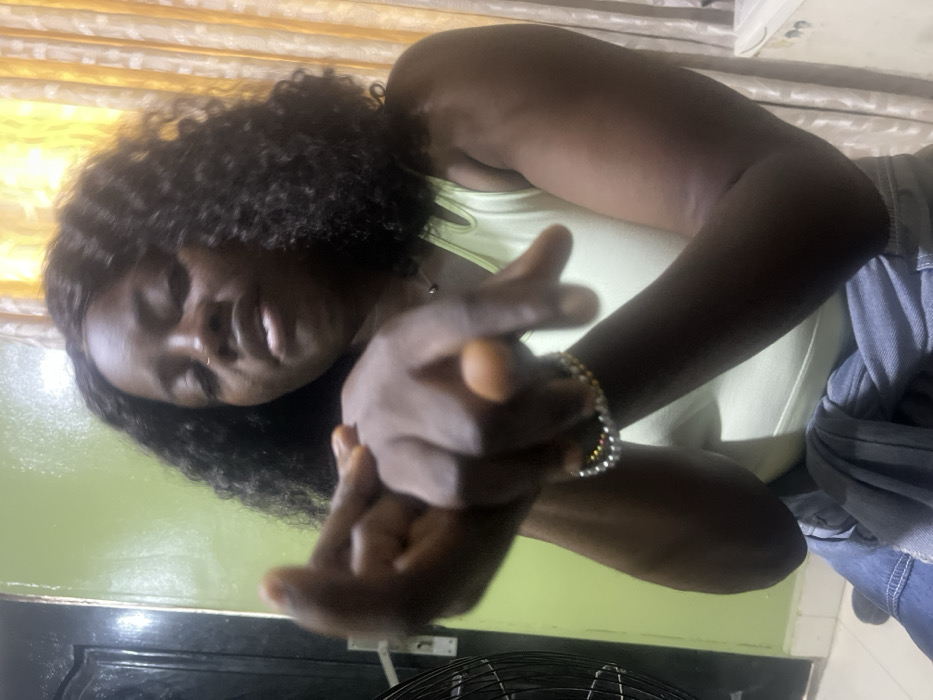 An image captured indoors in Langbasa, Nigeria, displays a female subject, estimated to be an adult, presented from the mid-torso upward