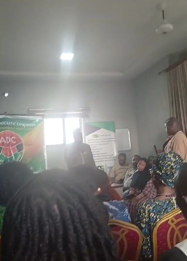 room with several people attending what appears to be a meeting or presentation. In the foreground are the backs of attendees, one with long dreadlocks. A person stands and speaks to the group, holding what looks like papers in one hand. Behind them are two banners: one for the African Democratic Congress (ADC) with its logo, and the other for a company called "GCS Fibers Nig. LTD," detailing its purpose of repurposing toxic coal ash into mineral fibers. The room is brightly lit by a ceiling light and natural light coming through a window behind the speaker. There are several people seated and listening to the speaker. The room appears to be modestly sized, with chairs arranged in rows and a serious tone.