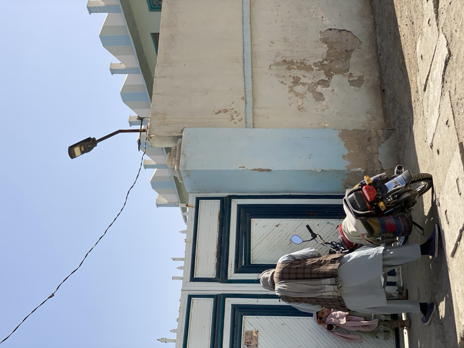 A man in a shalwar kameez and vest sits on a motorcycle in front of a white door with blue trim. The motorcycle has a red and black pack on the back. Above the door is a light blue painted wall and a peeling white wall. The sky is pale blue, and a streetlight juts out from the building. To the right is a concrete wall in shadow.