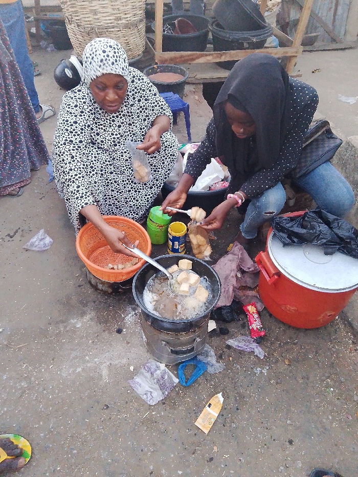 Two women are squatting near a portable cooking stove. One wears a black and white dress with a head covering and is transferring food from a plastic bag into a basket. The other wears a hijab, blue jeans, and a spotted blouse, and uses a spoon to transfer food from a plastic bag into the pot of oil on the stove. A red container and some scattered trash are visible around the stove. The scene appears to be an outdoor food stall, possibly frying tofu.