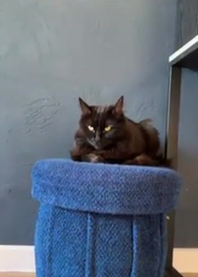 A medium shot shows a fluffy, dark brown cat resting on a blue, cushioned stool