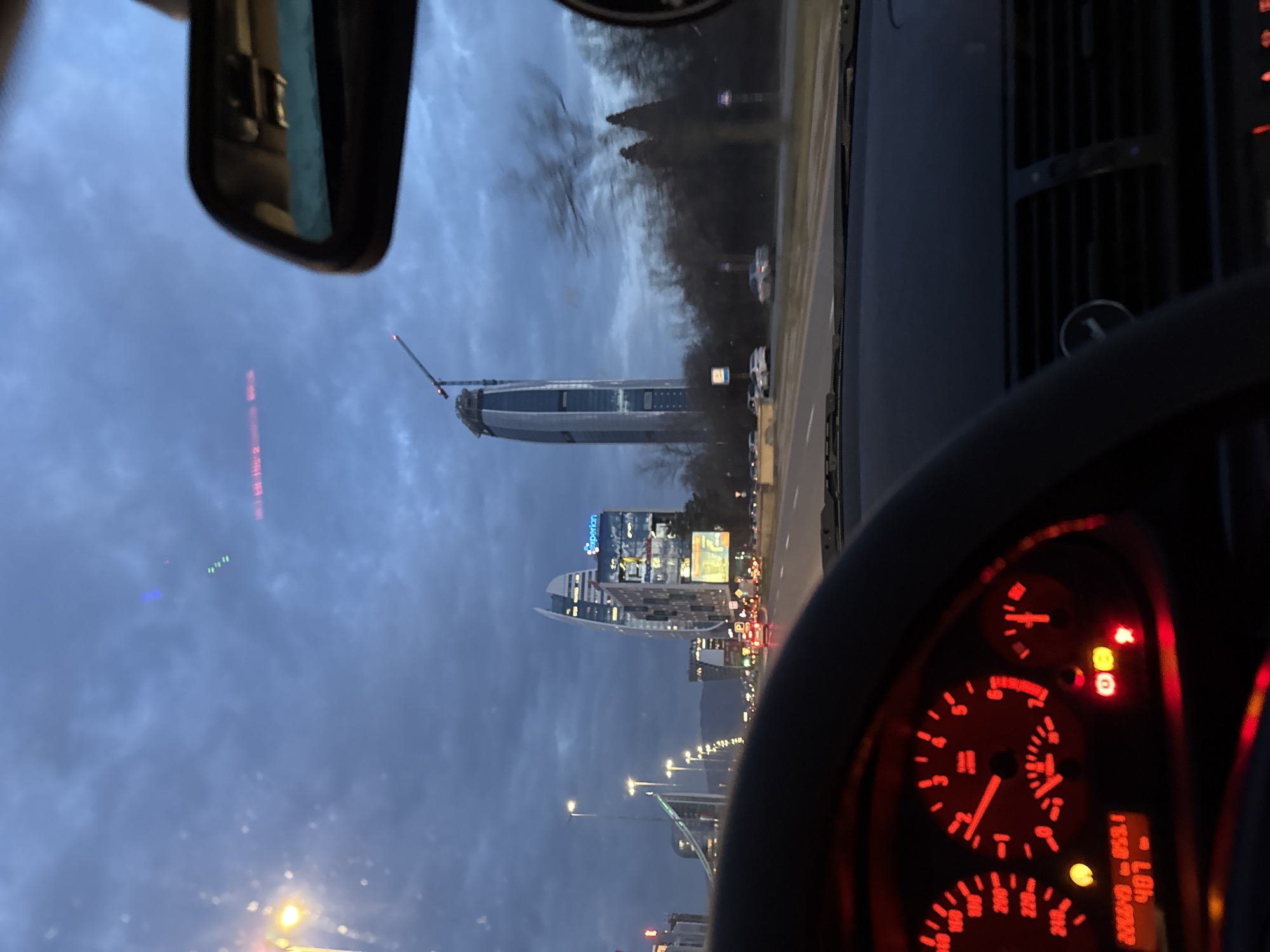 The image depicts an exterior view from within a moving vehicle on Tsarigradsko Shose boulevard in Sofia, Bulgaria, at dusk or early night. The sky above is overcast with dark blue-grey clouds. In the immediate foreground, the lower portion of a dark steering wheel obstructs the view. The vehicle's dashboard is prominently displayed, featuring red-illuminated analog gauges for speedometer, tachometer, fuel level, and engine temperature. A digital odometer or trip meter displays "220073" and "059.1". Several orange and red warning indicator lights are illuminated on the dashboard, including one commonly associated with a parking brake and another general warning light. A blurry rearview mirror is partially visible in the upper right quadrant, reflecting a faint bluish-green light. Outside the vehicle, a multi-lane asphalt road appears wet, reflecting light sources. Streetlights with yellow-white illumination line both sides of the road, extending into the distance. Multiple vehicles are visible on the road ahead, identifiable by their red taillights. To the left, several illuminated modern buildings are present, including the distinctively curved Capital Fort building, displaying "Experian" signage. To the right, the tall, slender structure of Sky Fort is seen under construction, with a large crane positioned at its apex. Dark, bare trees line the right side of the road parallel to the vehicle's direction of travel. Distant urban lights are faintly visible in the background.