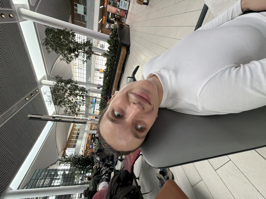 The image captures a female subject posing for a close-up photograph within the Istanbul Airport (IST) terminal, located in Arnavutköy, Turkey. The female, with light skin and dark hair, is visible from the chest up, wearing a white long-sleeved turtleneck shirt. Her head is tilted to the left, resting against the gray padded backrest of an airport chair, and she gazes upward and to the right with a slight smile. To the left of the frame, a red airport waiting chair is partially visible, with a dark bag draped over it and a pair of grey and blue sneakers on the tiled floor beneath. The background reveals the expansive, brightly lit interior of a modern airport concourse. This area features high, vaulted ceilings with integrated linear lighting and large windows. Several large planters containing mature leafy green trees are arranged along a walkway, accompanied by integrated wooden benches. Rows of red airport waiting chairs are visible in the mid-ground, occupied by several indistinct individuals. Digital signage, including a visible "F17" gate indicator, and various commercial outlets are discernible in the distance. The floor is composed of large, light-colored square tiles. The overall environment suggests a passenger waiting area within an active airport terminal.