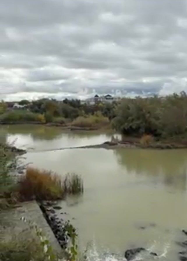 wide river under a cloudy sky. The water is murky, light green in color. The riverbank is lined with trees and low-lying vegetation. On the left side of the frame, an old stone bridge spans the river. The bridge is made of arched spans and has a tower at its edge. People can be seen walking across the top of the bridge.