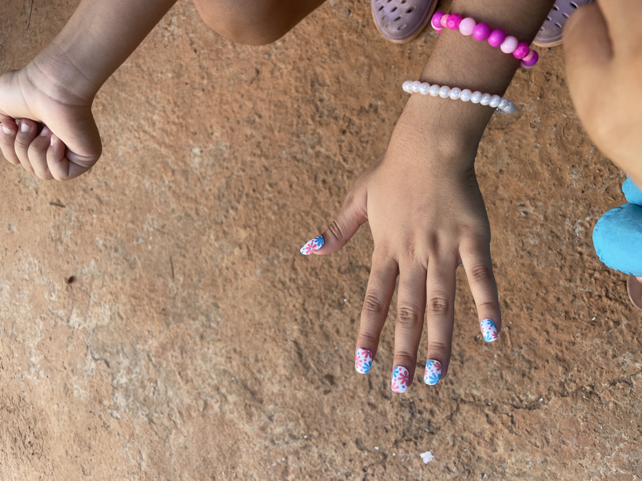 The image displays an overhead perspective of hands and an outdoor ground surface in Anápolis, Brazil. The primary subject is a left hand, positioned centrally, featuring fingernails adorned with white, pink, and light blue floral patterns. The wrist is accessorized with two bracelets: an inner white beaded bracelet and an outer pink beaded bracelet. In the upper-right corner, the lower forearm and clenched fist of another individual are partially visible. A purple, open-toed sandal or shoe is partly visible in the lower-right quadrant. A fragment of a bright turquoise fabric object is present in the lower-center. The background consists of a reddish-brown, textured ground, indicative of a paved outdoor area or weathered concrete.