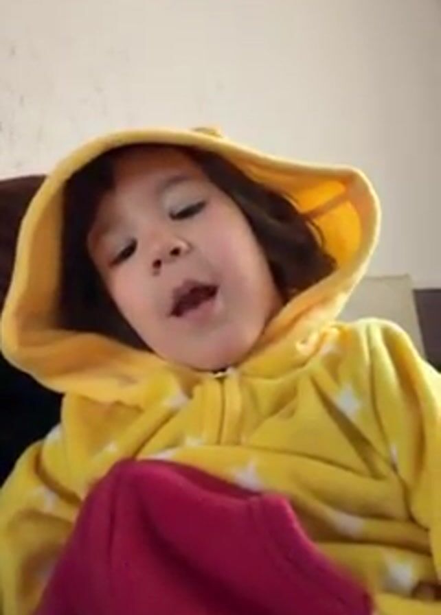 A young child, likely a toddler, wearing a yellow hooded onesie with white star patterns and small bear ears on the hood, is looking directly at the camera and making various noises and facial expressions