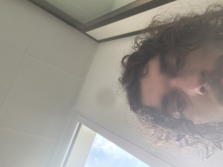 The image presents a low-angle, close-up view of an adult male, likely a self-portrait. The subject's face occupies the lower portion of the frame, featuring dark, curly hair, a mustache, and dark eyebrows. His gaze is directed downwards or away from the camera. The background depicts an interior space situated in Vincennes, France. To the upper left, a white window frame reveals an exterior view of a blue sky with scattered white clouds. The ceiling, visible across the top, is white and composed of distinct rectangular panels. A vertical, dark, reflective surface, possibly a glass partition or door, is visible along the right edge of the frame. The scene is illuminated by natural daylight, and the image displays a slightly diffused optical quality.
