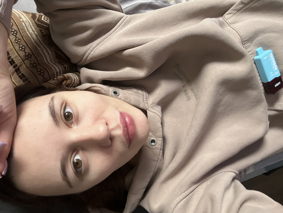 An overhead portrait shows a female individual lying down in an indoor setting within the city of Leninakan, Russia. She has fair skin, brown eyes, and naturally appearing eyebrows, with her lips tinted a light pink. Her dark brown hair is partially visible behind her head. She is wearing a light tan or beige hooded sweatshirt with the phrase "less stress more dancing" embroidered in a darker shade on the chest. Her left hand, featuring light purple painted fingernails, is visible at the top of the frame, near her forehead. A light blue and maroon disposable vape, branded "FIZZY THUNDER 7000 PUFFS," rests on the front pocket area of her sweatshirt. Behind her head, a patterned brown and beige textile, possibly a pillow or blanket, is visible. Lighter fabric, likely bedding, is visible on the surrounding surfaces. The individual is looking directly into the camera.