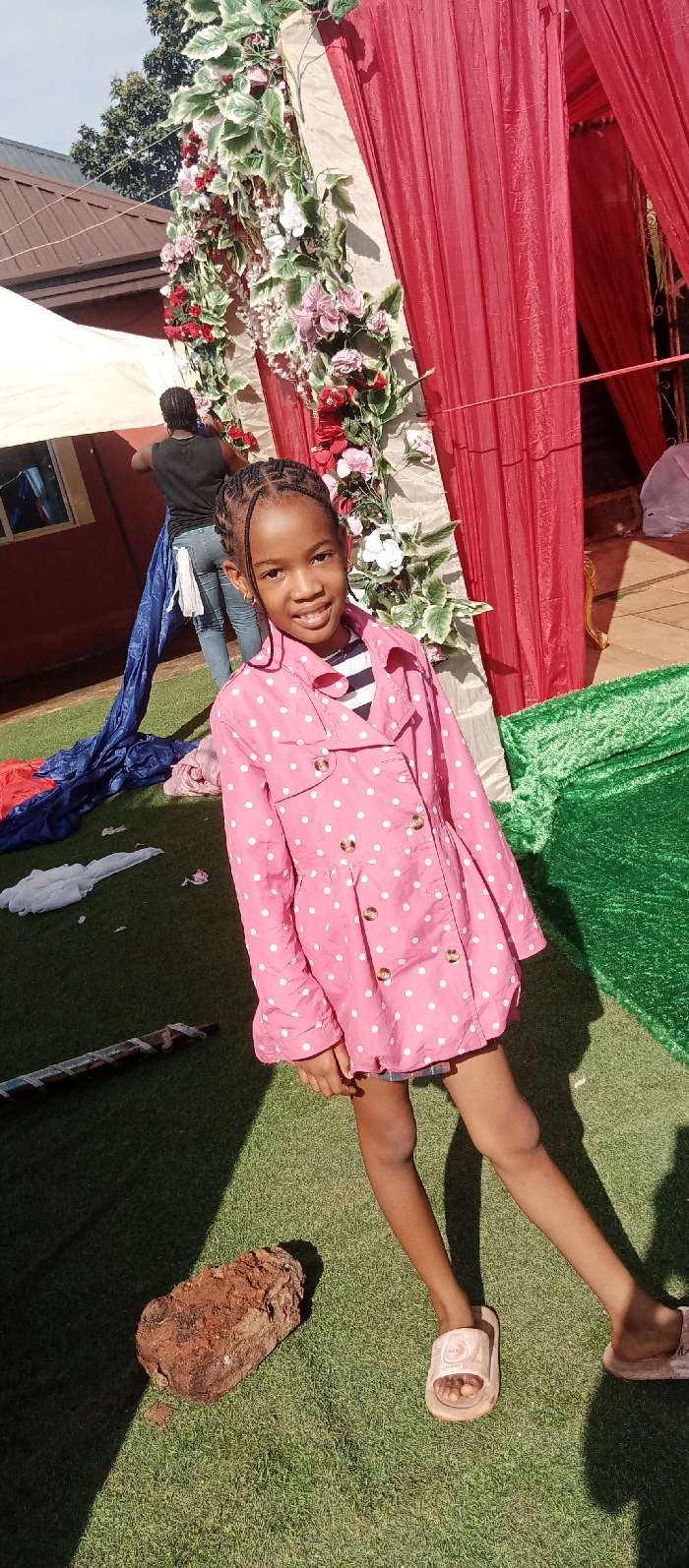 The image depicts an outdoor scene in Udi, Nigeria, featuring artificial green turf under direct sunlight. A young girl stands prominently in the foreground, angled slightly to the left, facing the camera with a smile. She has dark skin, braided hair, and wears a pink long-sleeved jacket with white polka dots over a striped shirt, blue shorts, and light-colored slide sandals. Her left knee is bent, and her right leg is extended. In the mid-ground, an adult, viewed from behind, is bent over and manipulating piles of blue and red fabric on the turf. This individual has dark skin, braided hair, and wears a black top and blue jeans, with a white cloth tucked into the back of the waistband. Additional crumpled white fabric is on the ground nearby. To the right, a vertical decorative structure is draped with red fabric and adorned with artificial flowers in white, pink, and red, intertwined with green leaves. More red drapes are visible behind this structure. A reddish-brown, irregularly shaped object rests on the turf near the girl's left foot, and a banded cylindrical object lies on the turf to the left. In the background, a building with a reddish-brown roof and a white canopy tent are visible, along with green trees against a clear sky. Strong shadows are cast on the turf by the subjects and structures.