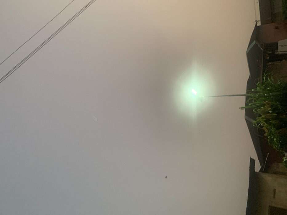 A dimly lit scene shows a sky obscured by haze or fog, transitioning from gray to a faint orange. Utility wires are visible in the upper left. A bright street lamp, emanating a green glow, stands on the right side. Adjacent to the lamp are portions of buildings with dark rooftops and greenery. A small, dark object is suspended in the sky near the bottom of the frame.