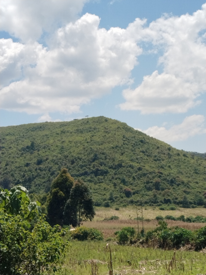 The image displays a rural landscape within Waseges ward, Kenya. A large, verdant hill, densely covered in green vegetation, occupies the background under a blue sky with scattered white cumulus clouds. A singular, small tree or object is faintly discernible near the hill's summit. The midground consists of a flat expanse of land, appearing to be an agricultural field with mixed green and brown growth, possibly indicating cultivated or recently harvested crops. The foreground is heavily vegetated with various green shrubs and plants. Two taller, darker green trees are present in the left-center of the foreground. No human activity, animals, or discernible artificial structures beyond the distant hill-top object are evident.