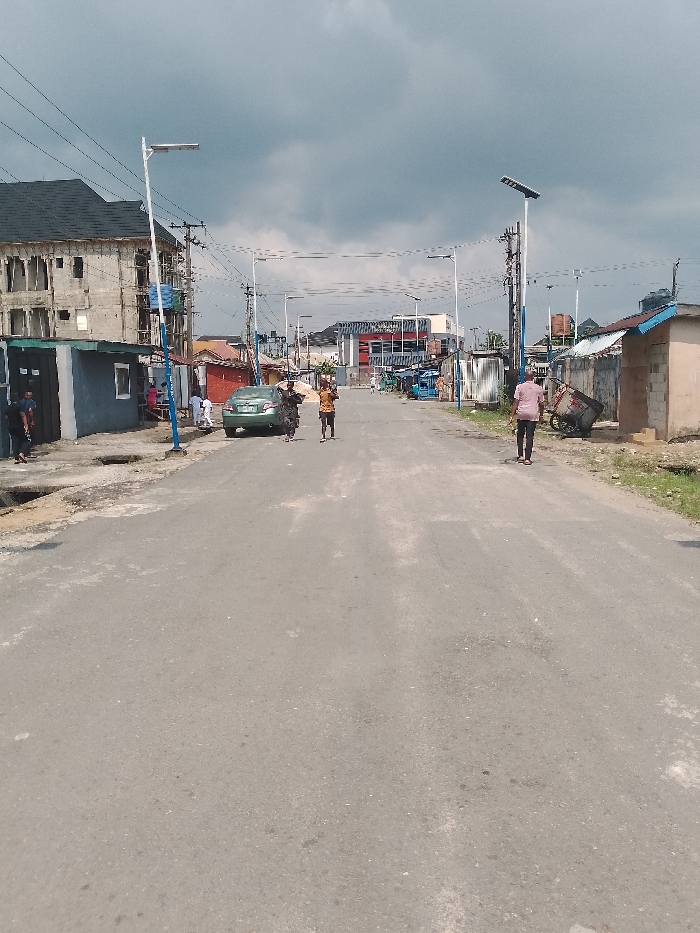 An asphalt road in Mgbuoshimini, Nigeria, extends into the distance under a heavily overcast sky. The road surface exhibits wear and minor repairs. On the left, an open concrete gutter runs alongside the road. A small, blue-grey building with a dark roof stands near an unfinished, multi-story concrete building featuring exposed rebar and a dark gabled roof. Several individuals are clustered near these structures. A light green sedan is parked facing away from the viewer on the left side of the road. Utility poles with entangled wiring and white pole-mounted streetlights with solar panels are prominent features on both sides of the street. In the middle of the road, two individuals walk towards the viewer. The leading person carries a large, light-colored object on their head. A second person, slightly behind and to their right, also carries an item on their head. On the right side of the road, a man in a light pink shirt and dark trousers walks away from the viewer. A small, tan building with a blue roof is visible, along with an overturned, dark-colored wheelbarrow-like object on the dirt shoulder. Further down, another small, tan building with a flat roof is present. In the background, the street is lined with additional buildings, including a multi-story structure with red and blue accents on the distant right. Numerous streetlights continue along the road's length.