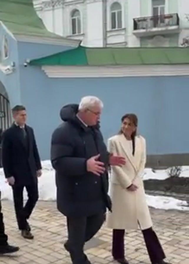 group of people walking on a brick pathway in front of a light blue building with a green roof. The group consists of three men and one woman. The man closest to the camera is wearing a dark blue puffer jacket and glasses, gesturing with his hands as he speaks. The woman beside him is wearing a cream-colored coat and maroon pants. Two other men are walking behind them, one in a dark suit and the other in a dark jacket. Patches of snow are visible on the ground near the building.