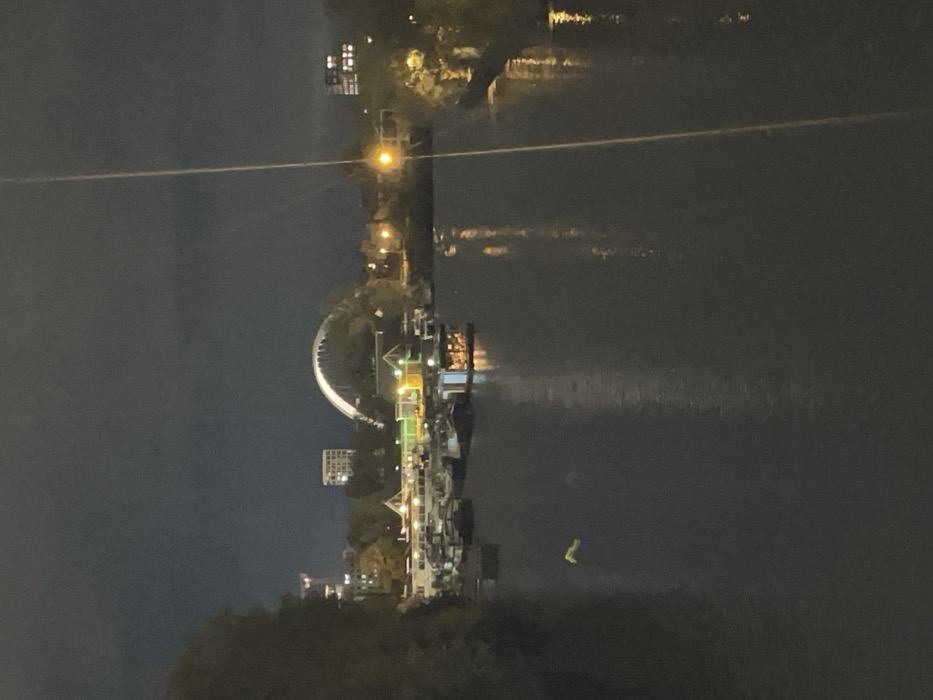 This nighttime image depicts an urban river scene in Strasbourg, France, specifically providing a view across the Rhine River towards the Passerelle des Deux Rives (Bridge of Two Shores). The perspective is from an elevated point on the French bank, looking eastward. The foreground and midground are dominated by the dark, still surface of the river, which reflects numerous artificial lights from the banks and structures. A thin, pale diagonal line, consistent with a wire or cable, traverses the upper right quadrant of the frame. In the mid-left area of the water, a small, luminescent green or yellow object is observed floating. Along the immediate left bank, which is the French side of Strasbourg, a series of approximately ten or more moored vessels, including apparent houseboats and barges, are visible. These boats are illuminated by various lights, predominantly warm yellow and bright green. Behind these vessels, a cluster of buildings with numerous illuminated windows and prominent signage indicates an active urban commercial or residential area. In the background, the distinctive white arch of the Passerelle des Deux Rives is brightly illuminated as it spans the river, connecting Strasbourg to Kehl, Germany. Beyond the bridge, additional urban buildings with scattered lights are discernible against the dark night sky on both sides of the river. No human figures or explicit actions are evident in the scene. The image exhibits a somewhat blurry and grainy quality, indicative of low-light photographic conditions.
