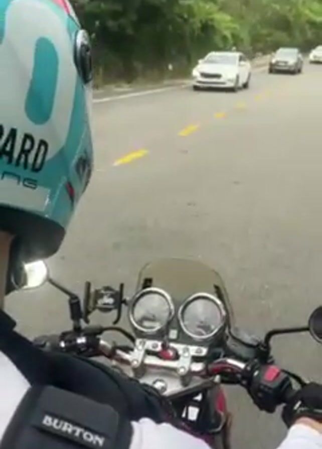A person wearing a blue and white helmet and a black Burton backpack is riding a red motorcycle on a two-lane road. There are other cars and motorcycles on the road. On the right-hand side of the road there are green hills and trees. There is also a sign indicating “Son Tra”. The weather appears to be overcast.