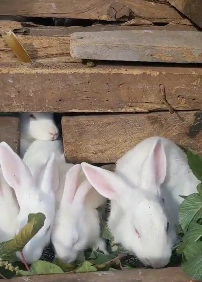 Several white rabbits are eating green leaves inside a wooden enclosure. The enclosure is constructed from rough-hewn planks. Some of the rabbits are adults while others are juveniles.