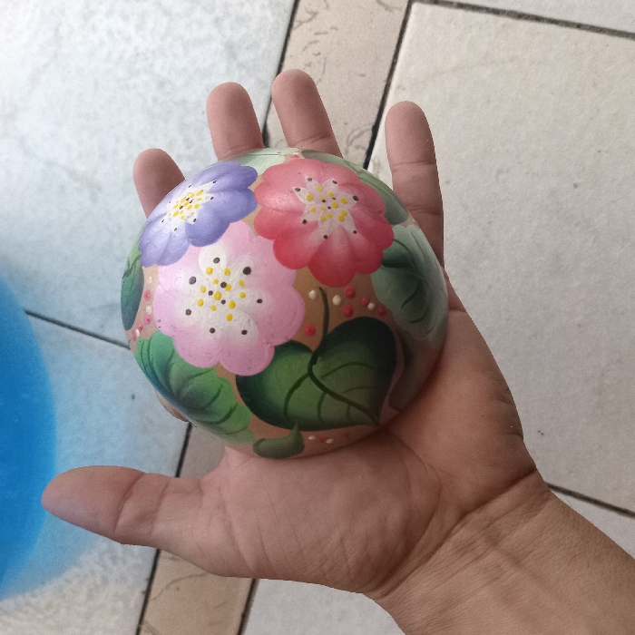 A left human hand holds a spherical, hand-painted object in the city of Duaca, Venezuela