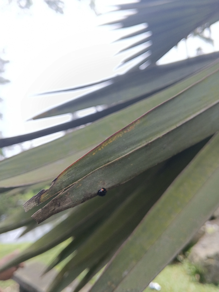 A close-up reveals palm fronds, primarily green with some brown edges. A small, dark, round insect rests on one of the fronds, its presence noticeable against the green. The background is blurred, suggesting a natural outdoor setting. The fronds dominate the frame, creating a natural, textured pattern.