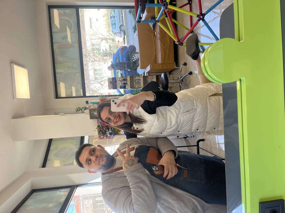 This image depicts a mirror selfie taken inside a commercial establishment in Sofia, Bulgaria. Two individuals are prominently featured. On the left, an adult male with a beard and visible tattoos on his right forearm wears a grey long-sleeved shirt over a white undershirt and a denim apron with a brown leather patch; he forms a "peace" sign with his left hand. A dark-colored smartphone in a brown case is tucked into his apron pocket. On the right, an adult female with dark hair and round glasses, dressed in a black long-sleeved top and a long white puffer vest, smiles broadly while holding a light-colored smartphone (an iPhone) to capture the reflection. The interior environment suggests a salon or shop, featuring a black rolling stool with a chrome base and a light brown leather-like sofa in the background. To the far right, a colorful children's play structure composed of connected yellow, blue, red, and green tubes is visible. Near the large street-facing window, a retail display stand contains multiple small items, possibly hair accessories or cosmetic products. Through the window, an urban street scene is visible, including bare trees, a blue SUV, a grey compact car, and a pedestrian walking in the distance. The ceiling is white and features two square, flat panel lights. A bright green fixture, possibly part of the mirror's frame or a counter, occupies the lower foreground of the image.