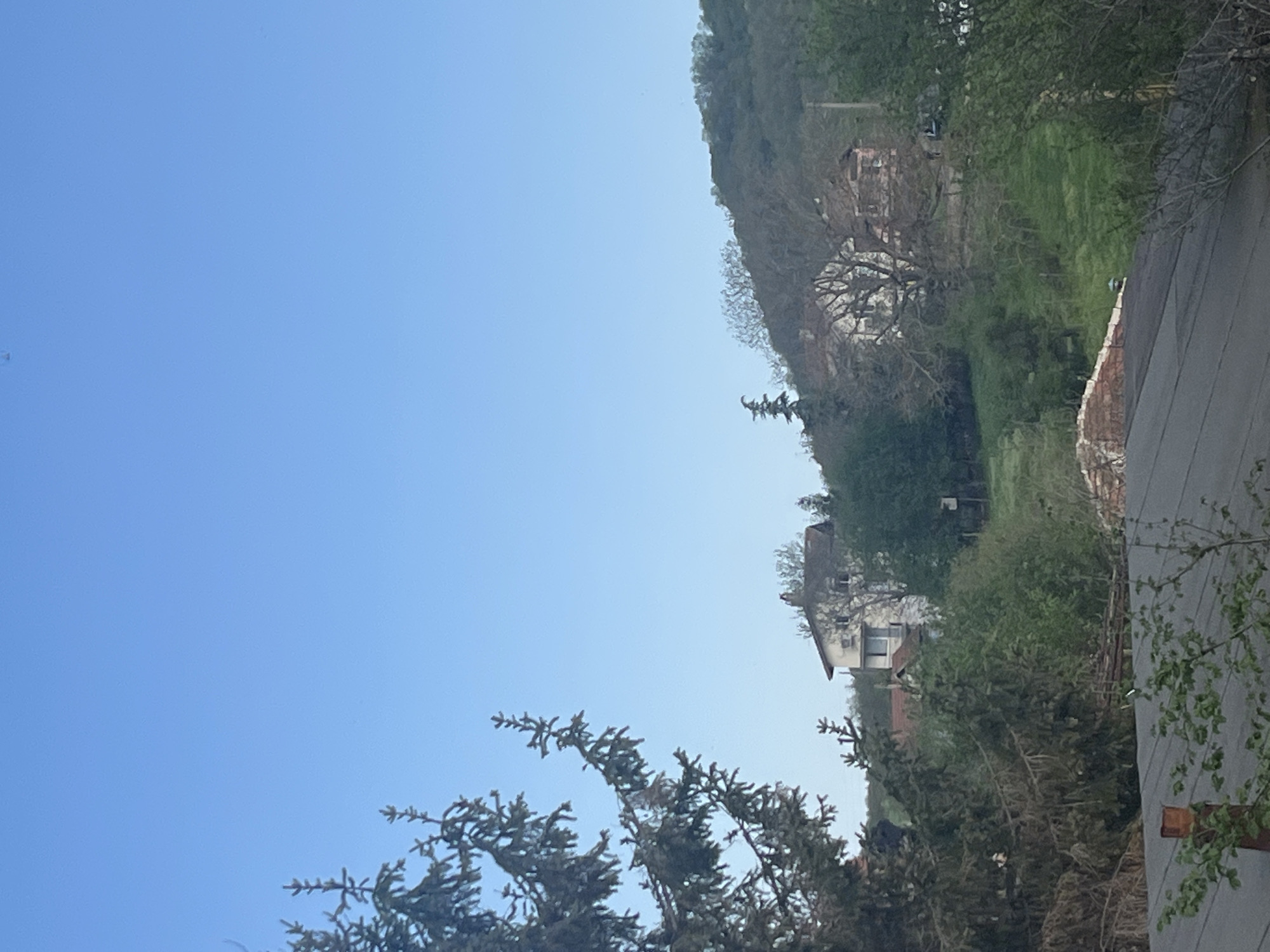 The image presents a landscape in what appears to be a rural or suburban area of Varshilo, Bulgaria. The sky is clear and blue. In the foreground, branches of evergreen trees are visible. The mid-ground contains residential buildings partially obscured by trees and vegetation. In the background, a tree-covered hillside slopes upwards. A portion of what looks like a building roof is visible on the bottom right side of the frame.