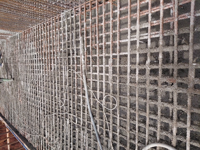 The image depicts a construction site in Fdalate, Morocco, showing a concrete slab in an intermediate stage of development. The primary visible surface is a dense, square grid of rusty steel rebar, partially embedded in and covered by unevenly distributed wet grey concrete. In the foreground, a grey, flexible hose, consistent with a concrete vibrator, rests diagonally across the rebar grid. A white electrical cable or rope is loosely coiled and extends across the rebar grid in the mid-ground. Along the right side of the frame, a vertical assembly of numerous closely spaced rebar rods forms a structural wall or column element, rising from the reinforced floor. In the upper-left corner, dark-colored formwork material, possibly wood, and additional rebar are visible along the perimeter. Two individuals are partially visible in the upper-center of the image, standing on the rebar grid. One person is identifiable by green rubber boots and dark trousers. The second individual, partially obscured, wears blue jeans and light-colored footwear. Their actions are limited to standing within the construction area.