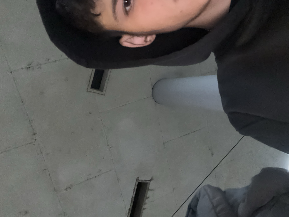 This image depicts a partial view of a young male individual captured indoors in Hœnheim, France. The subject is positioned on the right side of the frame, wearing a dark hooded sweatshirt with the hood pulled up. Only the right side of his face is visible, including a brown eye, a portion of his eyebrow, his right ear, and his jawline. Dark hair is visible beneath the hood. The background consists of a grey concrete ceiling, characterized by visible seams and rectangular panels. Two dark rectangular vents or fixtures are embedded in the ceiling, one in the upper right quadrant and another in the lower left. A light-colored, cylindrical column or pipe extends vertically from the ceiling in the mid-right background. A section of light grey material, likely fabric, is visible in the lower-left corner of the frame.