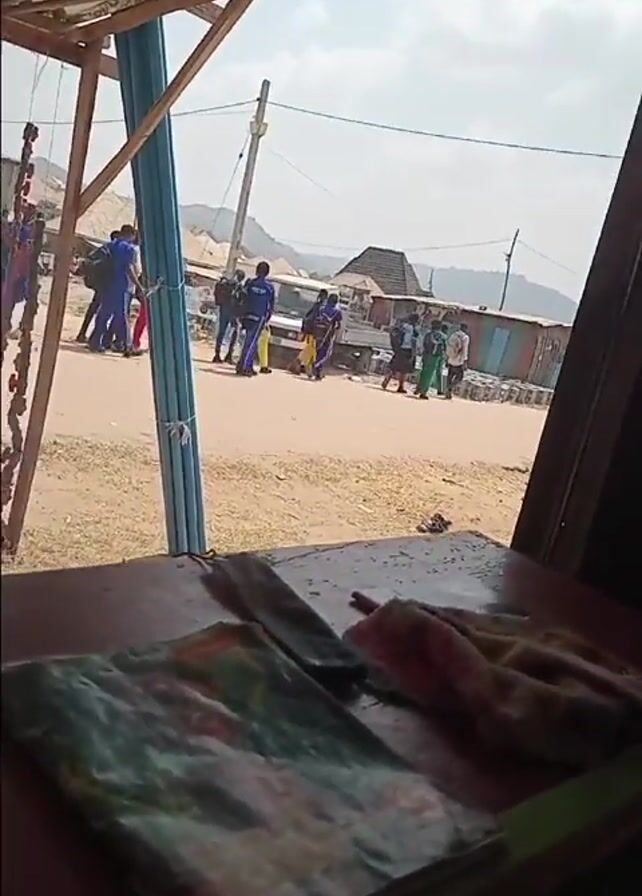 From a semi-enclosed space with a wooden structure, the video shows a dirt road with people in the distance