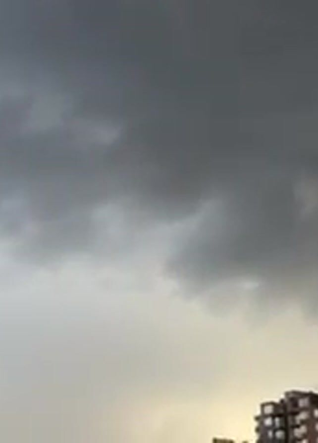 cloudy sky above a building. The clouds are dark gray and heavy, and there is a patch of lighter sky visible in the center of the frame. The building is a modern apartment complex with brick walls and many windows. The overall mood is one of impending rain or a storm.