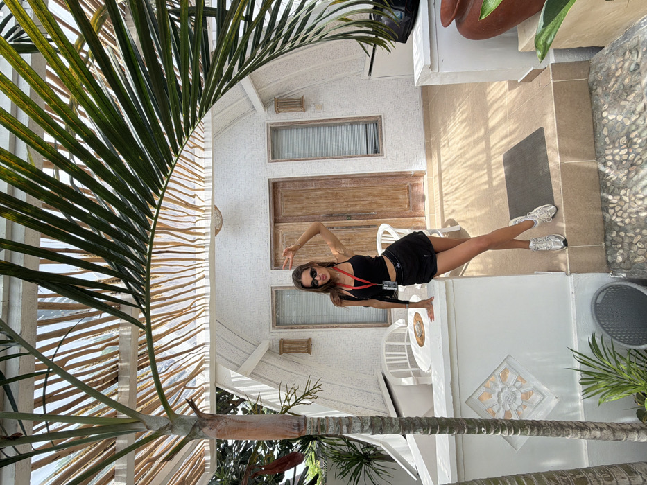 A woman in a black top and skirt poses with raised arms. She wears sunglasses and a red strap is around her neck. The setting is an outdoor patio with white furniture and a white building facade with wooden doors and windows. A large palm tree frond arches overhead, partly obscuring a white pergola. The ground is tiled and includes a stone-covered section.