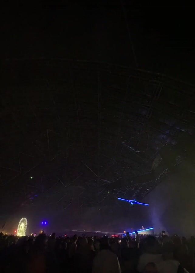 large crowd of people at a concert, at night, indoors. The ceiling of the venue is high and has a complex geometric pattern, illuminated by bright white spotlights. Blue laser beams are also visible. In the distance, beyond the crowd, is a Ferris wheel. Most people in the crowd are looking towards the stage, with some raising their hands or holding up their phones. The overall atmosphere is dark and energetic.